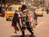This piece shows a picture of a man wandering the streets of Lagos Nigeria with loads of clothes hoping to make some sales and to give his customers and buyers enough options and varieties to choose from.