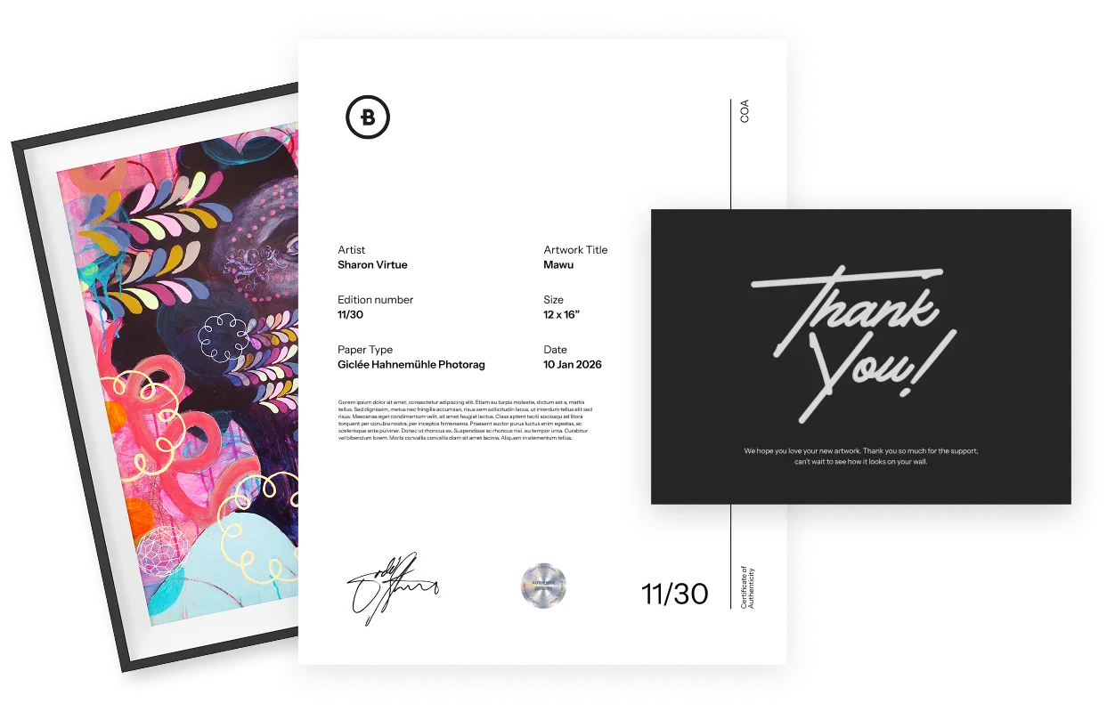 At BetterShared we print on archival, acid-free, and lignin-free papers. Every order is produced to the highest standard regardless of the edition amount. Limited editions include a signed certificate of authenticity and edition tracking. We pride ourselves on providing museum-quality giclée prints on-demand. Meaning we only print when an order is made, so no there's upfront print costs.